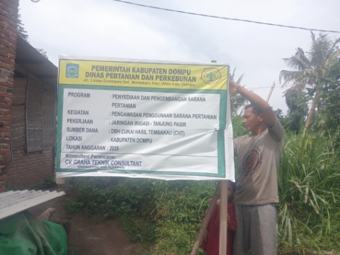 Nampak seorang petani di Dusun Pasir Putih Desa Calabai saat menunjuk papan informasi proyek saluran irigasi yang bersumber dari DBHCHT Tahun 2025.