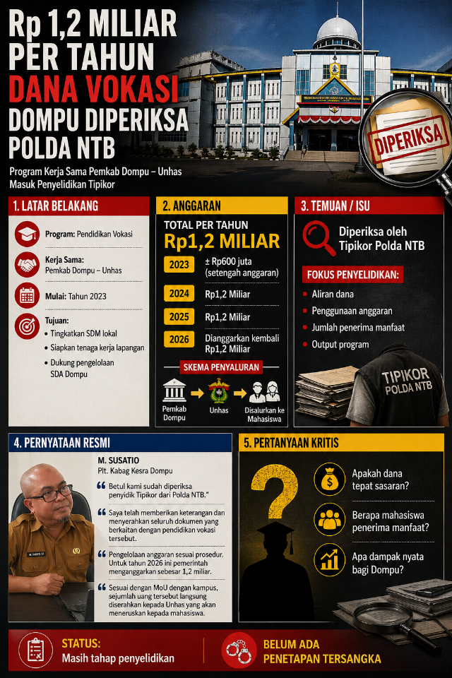 DOMPU — Program pendidikan vokasi hasil kerja sama Pemerintah Kabupaten Dompu dengan Universitas Hasanuddin (Unhas) kini masuk radar penyidik Tindak Pidana Korupsi Polda NTB. ‎